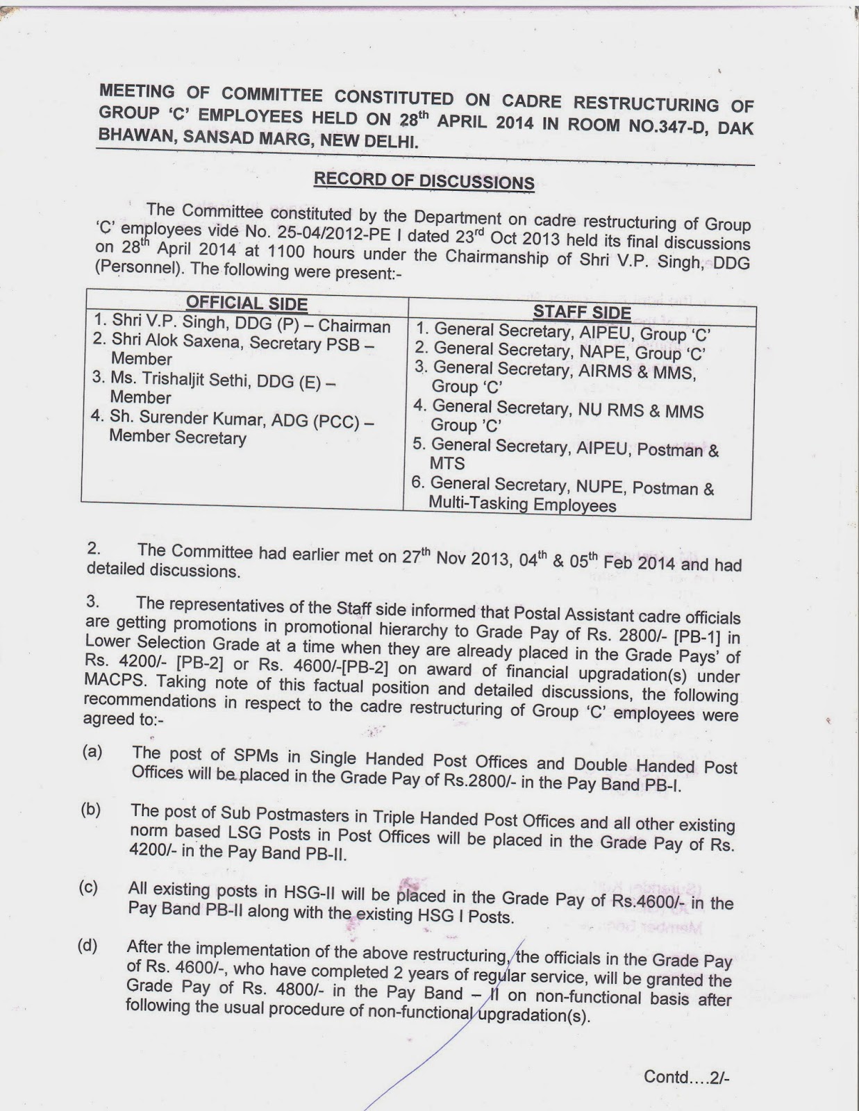 At last after several round of protracted negotiations with the administration, JCM Staff side, Departmental council ( NFPE & FNPO) has signed the cadre restructuring proposal. The staff side has tried to the best of its ability to make maximum improvement in the proposal. In spite of our hard bargaining we could not achieve 100 percent success. Our demand for separate higher pay scale for PO& RMS Accountants, Creation of separate cadre for System Administrators or grant of special pay/allowance, bringing MTS also under cadre restructuring etc is not accepted by the administration. Regarding Postmaster Cadre after much bargaining, it is agreed to examine our claim for higher pay scale after the present proposal is approved by the government.